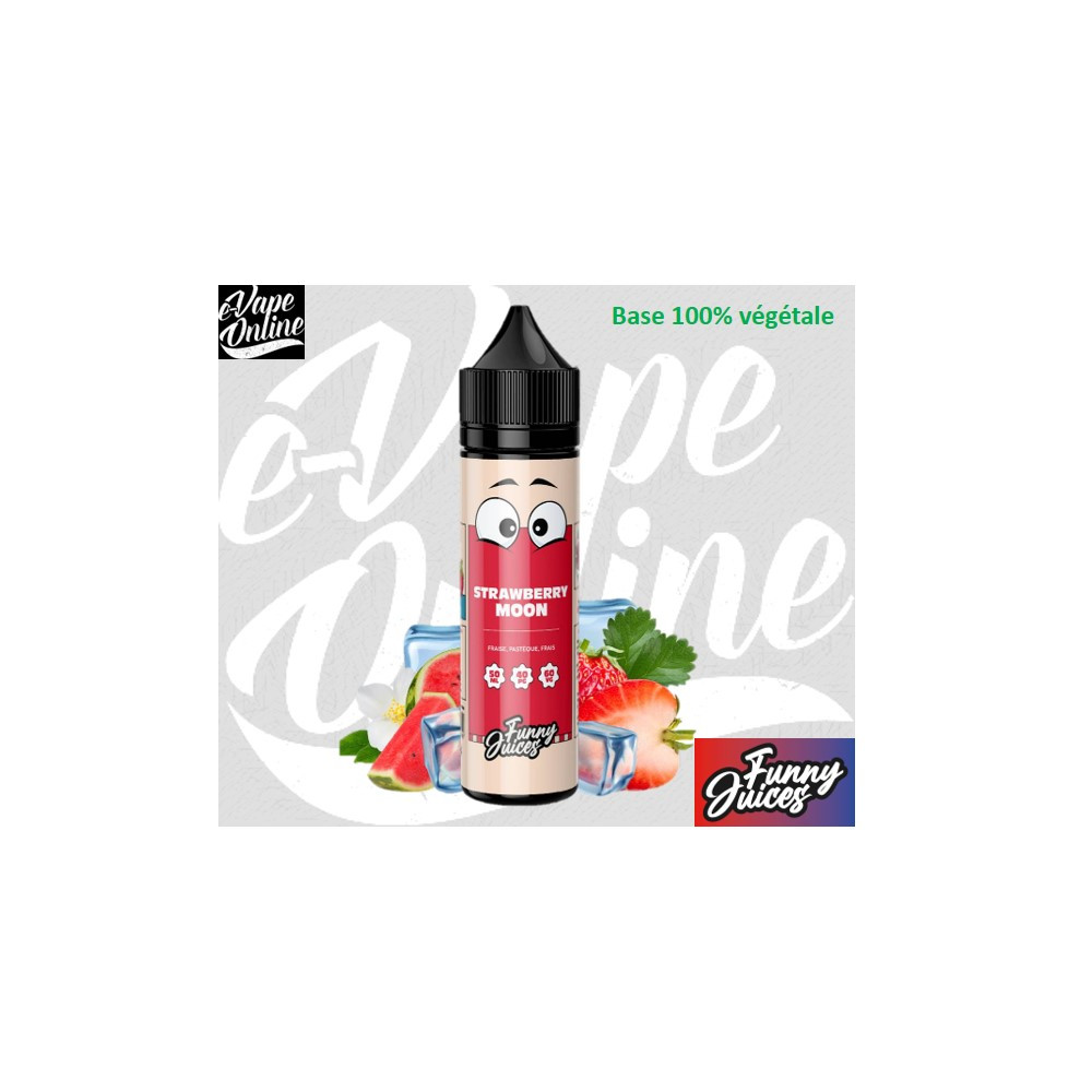 L'Eliquide STRAWBERRY MOON de FUNNY JUICES: Une généreuse fraise 🍓 bien sucrée, une pastèque 🍉 juteuse et une pointe de jasmin.